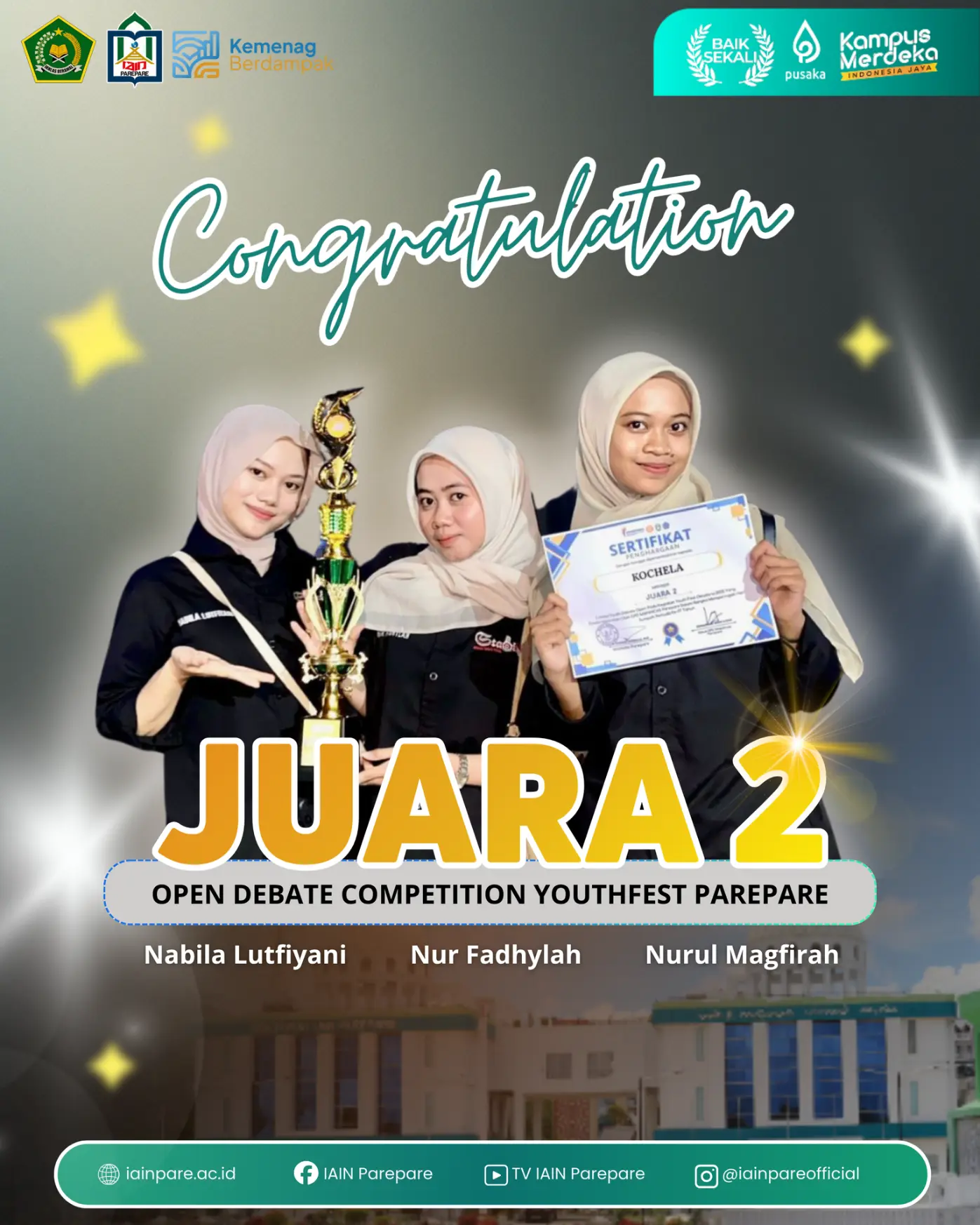 “Kami sangat mengapresiasi perjuangan dan dedikasi mahasiswa yang telah membawa nama baik IAIN Parepare. Prestasi ini menunjukkan bahwa mahasiswa kita memiliki potensi luar biasa dalam berpikir kritis, berargumentasi, dan berkompetisi secara sehat,” ujarnya.