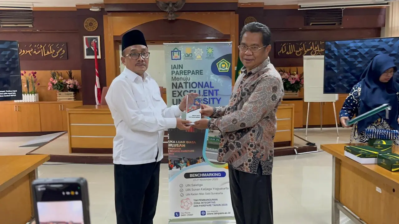 Humas IAIN Parepare — Tim Zona Integritas (ZI) IAIN Parepare memasuki hari kedua rangkaian benchmarking dengan melanjutkan kunjungan ke Universitas Islam Negeri (UIN) Sunan Kalijaga Yogyakarta, Selasa (25/11/25). Rombongan IAIN Parepare, yang dipimpin oleh Kepala Biro Administrasi Umum, Akademik, dan Kemahasiswaan (AUAK), Dr. H. Muhdin, S.Ag., M.Pd.I., disambut dengan hangat oleh Kepala Biro UIN Sunan Kalijaga, Dr. H. Ali Shodiq, S.Ag., M.A., beserta tim ZI kampus tersebut di Gedung Syaifuddin Zuhri.